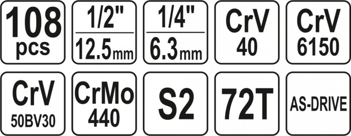 Klucze nasadowe, jak i napęd nasadek, zostały wykonane z wytrzymałej, narzędziowej stali chromowo-wanadowej CrV 50BV3. Nasadki wykonano metodą kucia matrycowego, a przed procesem hartowania poddano je kalibracji za pomocą precyzyjnych przymiarów i urządzeń kontrolnych. Nasadki wyposażone w system AS-Drive, zwiększający maksymalny moment o 25%, przy pełnej ochronie obrzeży nakrętek, nasadki z dwutonowym wykończeniem powierzchni. W skład zestawu wchodzą również bity wykonane z twardej stali S2. Zestaw umożliwia pracę wymagającą bardzo dużych obciążeń i precyzji, pozwala wykonywać wiele czynności serwisowych związanych z odkręcaniem i przykręcaniem połączeń gwintowych o różnych rozmiarach nominalnych.