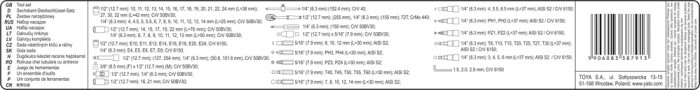 Nasadki 1/2": 10; 11; 12; 13; 14; 15; 16; 17; 18; 19; 20; 21; 22; 24 mm, L= 38 mm; 27; 30; 32 mm, L= 42 mm Nasadki długie 1/2": 14; 15; 17; 19; 22 mm, L= 76 mm Nasadki 1/2" torx: E10; E11; E12; E14; E16; E18; E20; E24 Nasadki 1/4": 4; 4.5; 5; 5.5; 6; 7; 8; 9; 10; 11; 12; 13; 14 mm, L= 25 mm Nasadki 1/4":6; 7; 8; 9; 10; 11; 12; 13 mm, L= 50 mm Nasadki 1/4" torx: E4; E5; E6; E14; E7; E8 Grzechotka 1/2", 72T, 255 mm Grzechotka 1/4", 72T, 155 mm Pokrętło przesuwne 1/4", L= 152,4 mm Pokrętło wkrętakowe 1/4", L= 150 mm Przedłużki 1/2": 125 mm; 250 mm Przedłużki 1/4": 50 mm; 100 mm Przedłużka elastyczna 1/4" 150 mm Nasadki do świec 1/2": 16; 21 mm Przegub Cardana: 1/2" i 1/4"" Redukcja: F3/8" x M1/2"" Adapter do bitów 1/4" Adapter do bitów 5/16" z 1/2"" Bity 5/16": - TORX: T40; T45; T50; T55 - Krzyżowe PHILIPS: Ph3; Ph4 - Krzyżowe POZIDRIV: Pz3; Pz4 - Płaskie: 8; 10; 12 mm - Sześciokątne: 8; 10; 12; 14 mm Końcówki wkrętakowe Torx na nasadce 1/4": T8; T10; T15; T20; T25; T30 Końcówki wkrętakowe krzyżowe Philips na nasadce 1/4": Ph1; Ph2 Końcówki wkrętakowe krzyżowe Pozidriv na nasadce 1/4": Pz1; Pz2 Końcówki wkrętakowe płaskie na nasadce 1/4": 4; 5.5; 7 mm Końcówki wkrętakowe sześciokątne na nasadce 1/4": 3; 4; 5; 6 mm Klucze imbusowe: 1.5; 2; 2.5 mm Walizka