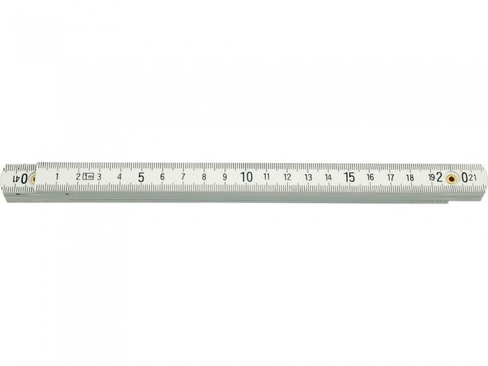 Miara składana o długości 2 m wykonana z tworzywa sztucznego. Kolor miarki biały. Odporna na działanie wilgoci. Elementy miary połączone mosiężnymi nitami. Do wykonywania pomiarów i trasowania w zakresie 2 m. Polecana do prac w środowisku wilgotnym.