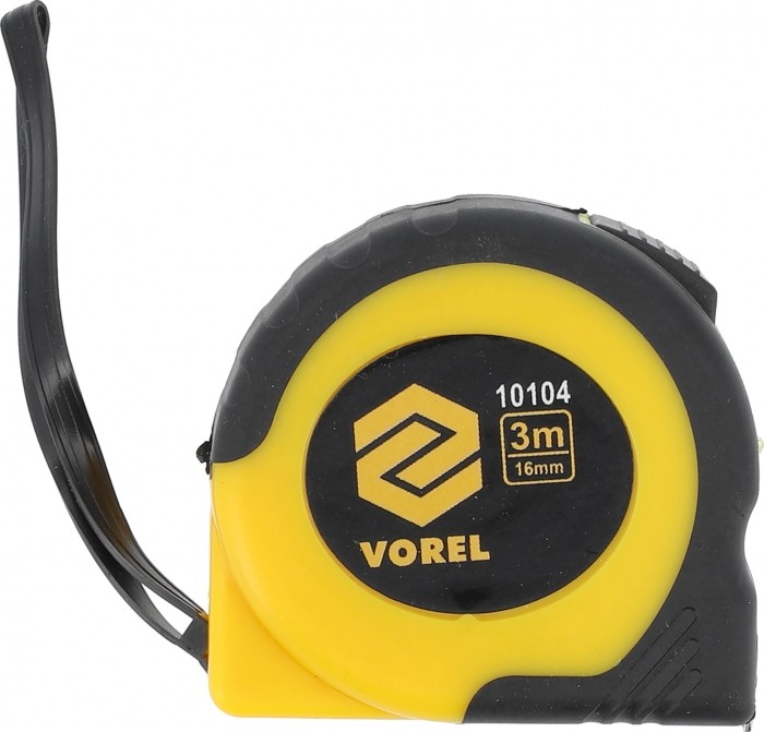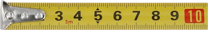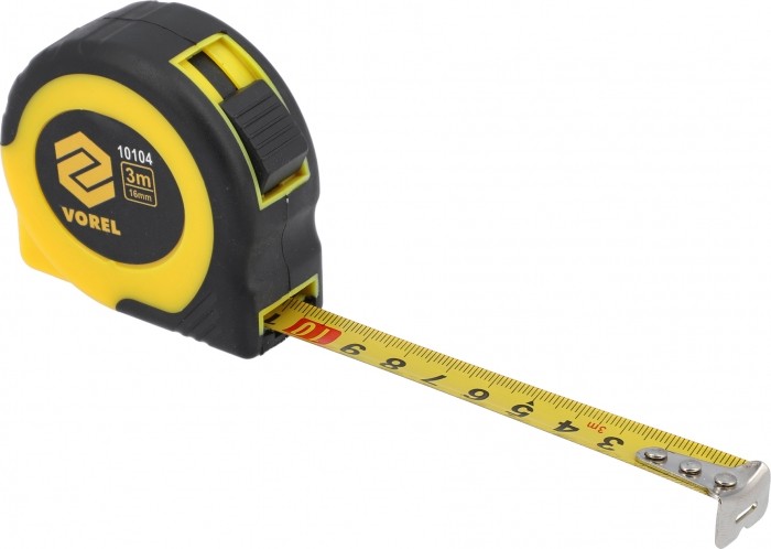 Taśma stalowa o długości 3 m i szerokości 16 mm zakończona ruchomym hakiem. Obudowa wykonana z tworzywa wzmocniona gumowymi nakładkami z klawiszem blokującym. Kaseta posiada klips do przypinania.
