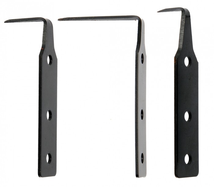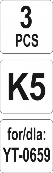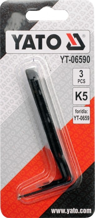 Zapasowe ostrza do specjalistycznego noża YT-0659, używanego w serwisach motoryzacyjnych do wycinania szyb samochodowych. W zestawie znajdują się trzy ostrza o różnych profilach, wykonane ze stali o symbolu K5. Wymiana w nożu do szyb YT-0659.