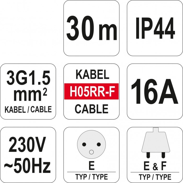 Wysokiej klasy przedłużacz izolowany o długości 30m. Przewód wykonany jest z 3 żył miedzianych o przekroju 1,5mm² każdy. Taki przekrój przewodu umożliwia podłączenie do tych przedłużaczy urządzeń często używanych na budowie, w warsztacie czy zakładzie produkcyjnym.