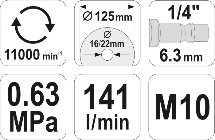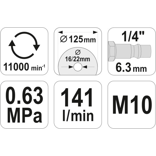 Wraz ze szlifierką dostarczane są: - rękojeść dodatkowa, - przyłącze do instalacji sprężonego powietrza - klucze do montażu i demontażu ściernicy