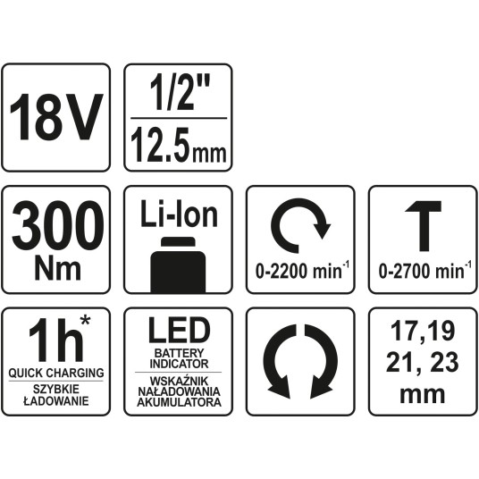 Mocny klucz udarowy 1/2 "do odkręcania kół(do rozmiaru M28)o mocy300 Nm. Udar styczny powoduje relaksację połączeń gwintowanych w zapieczonych śrubach, dokręconych nawet z momentem przewyższającym 300 Nm. Doskonały do prac w warsztacie oraz na budowie (dokręcanie poręczy, barier, szalunków oraz długich wkrętów ciesielskich).