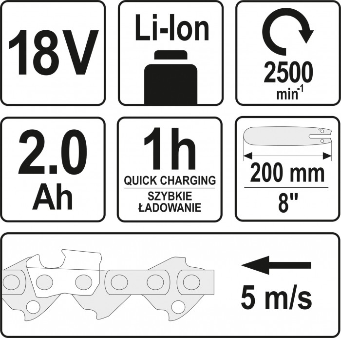 W zestawie: okrzesywarka, akumulator Li-Ion 18 V 2 Ah, szybka ładowarka (1 h dla baterii 2 Ah).
