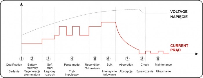 Posiada funkcję podtrzymywania prawidłowego napięcia w akumulatorach pracujących w trybie spoczynku - ładowanie konserwujące.