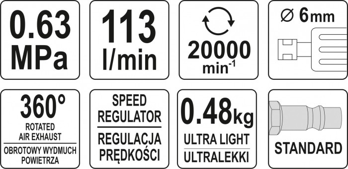 Profesjonalna szlifi erka pneumatyczna zasilana strumieniem sprężonego powietrza pod ciśnieniem. Za pomocą odpowiednich tarcz umożliwia cięcie i szlifowanie różnych materiałów. Stosowana w serwisach motoryzacyjnych i w przemyśle.