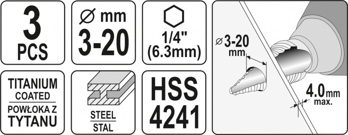 ZESTAW WIERTEŁ STOPNIOWYCH 3SZT.