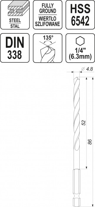 WIERTŁO DO METALU HSS 6542 4,8MM HEX