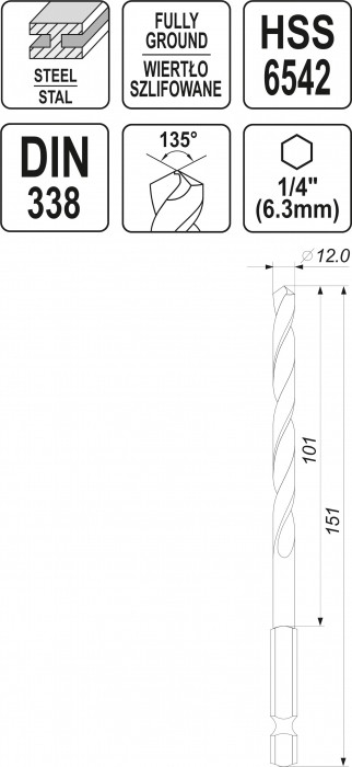 WIERTŁO DO METALU HSS 6542 12,0MM HEX
