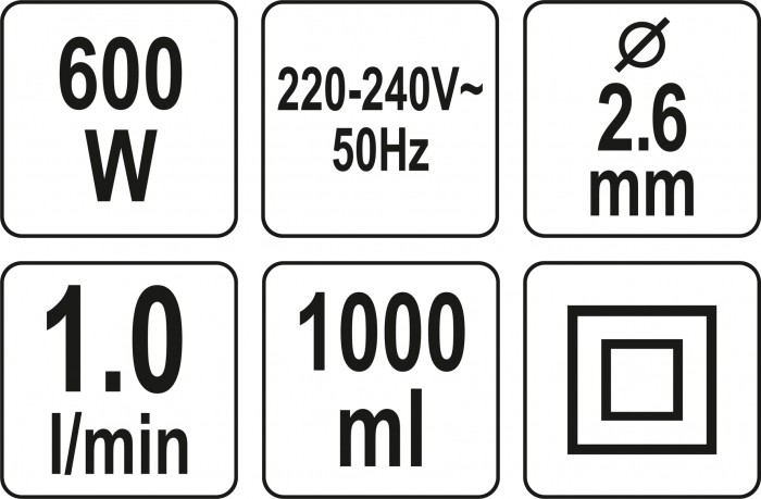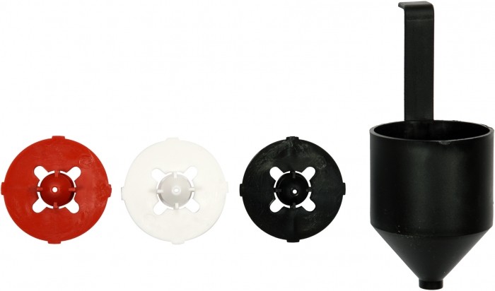 w zestawie wymienne dysze o średnicach: 1,5 mm, 1,8 mm i 2,2 mm oraz wiskozymetr do mierzenia gęstości farby