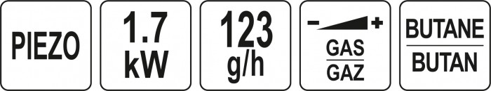 Obudowa wykonana z odpornego na uszkodzenia mechaniczne tworzywa - chroni przed oparzeniami. Wygodny do operowania uchwyt pistoletowy z pokrętłem regulacji wypływu umieszczonym pionowo nad butlą. Palnik mosiężny fi 19 mm z mosiężnym wkładem, posiada skuteczny zapalacz piezo / klawisz na uchwycie /. Docisk butli w korpusie za pomocą wkręcanej płyty podstawy. Wymiary 190 mm x 250 mm. Waga netto 725g