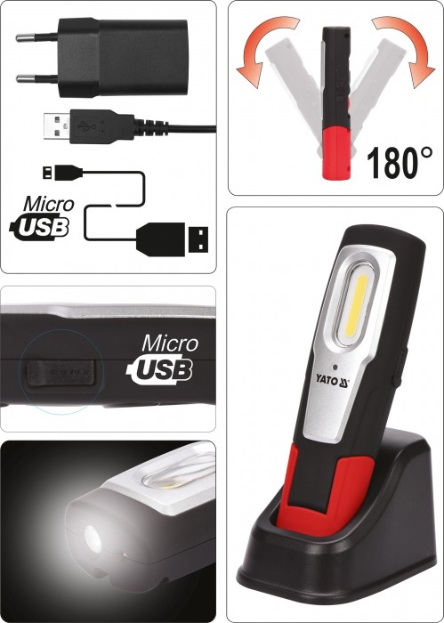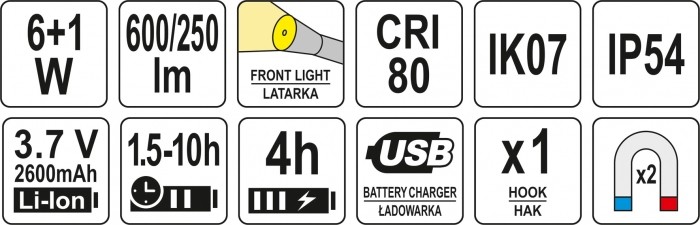 Akumulatorowa lampa warsztatowa Yato ze światłem głównym 600lm oraz latarką 120lm. Model wyposażony w litowo-jonową baterię o pojemności 2600mAh zapewni minimum od 1,5 do 10 godzin ciągłej pracy. Wykonany z wytrzymałych materiałów, m.in. ABS i poliwęglanu zapewnia klasę ochrony mechanicznej IK07 oraz klasę szczelności IP54. Obrotowy korpus, haczyk oraz 2 magnesy umożliwią właściwe ustawienie strumienia światła. Dodatkowym atutem jest stacja magnetyczna służąca do bezprzewodowego ładowania lampy.