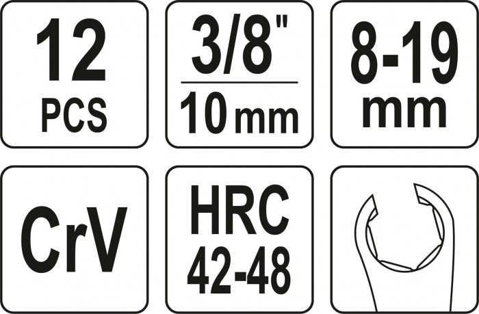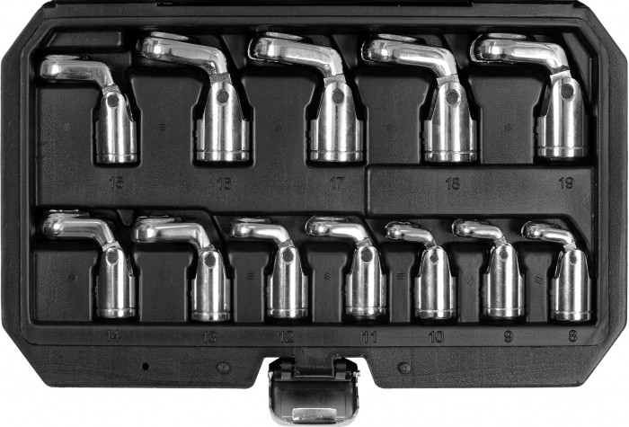 Zestaw kluczy przegubowych oczkowych otwartych. Doskonale sprawdzi się przy odkręcaniu i dokręcaniu wszelkich czujników z przewodami elektrycznymi, odpowietrzników hydraulicznych, pneumatycznych czy paliwowych bez ryzyka ich uszkodzenia. Otwarte oczka oraz wygodny przegub znakomicie ułatwiają pracę w miejscach z ograniczonym dostępem. Materiał wykonania CRV o HRC 42-48 sprawiają, że klucze są wytrzymałe. Plastikowa, mocna walizka zawiera 12 rozmiarów od 8- 19MM
