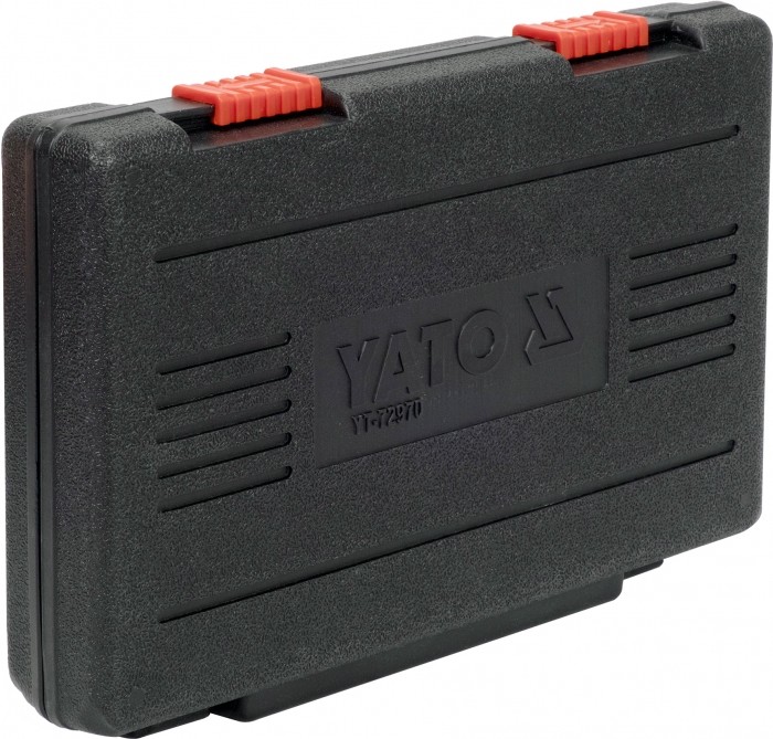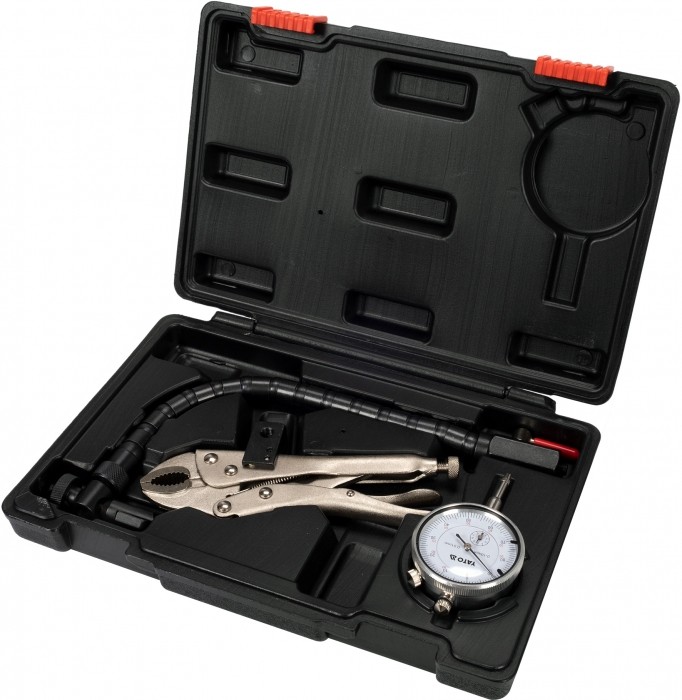 Zestaw do sprawdzania bicia tarcz hamulcowych: wskaźnik zegarowy o dokładności 0.01 mm, zakres 10 mm, elastyczne ramię z blokadą śrubową, zacisk mocujący.