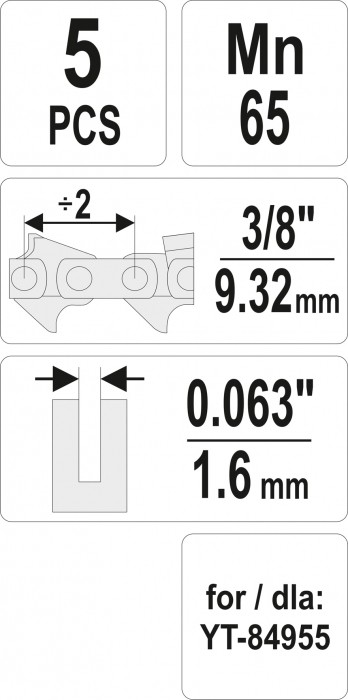 Zestaw składa się z5 kompletnych ogniwprzeznaczonych do zakuwania łańcuchów tnących do pilarek do drewna opodziałce 0,325" (8,25mm)orazszerokości 0,05" (1,3mm).