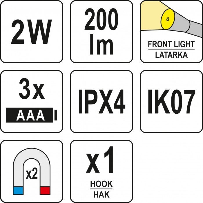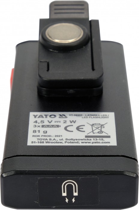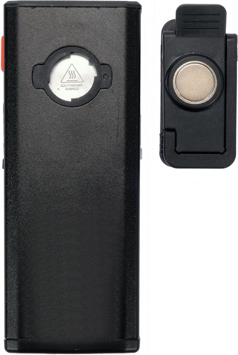 BUDOWA I CECHY: • Klasa szczelności IPX4 – produkt wodoodporny • Klasa ochrony mechanicznej IK07 • Rozmiar produktu: 112 x 48 x 37 mm • Waga bez baterii: 81 g • Magnes w podstawie • Klip • Magnes na klipsie • Hak • Obudowa: aluminium