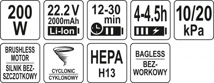 Akumulatorowy odkurzacz pionowy najnowszej generacji z silnikiem bezszczotkowym i systemem cyklonowym zapewnia dokładne odkurzanie różnego rodzaju powierzchni i miejsc. Gwarantuje moc ssania 20kPa porównywalną do wysokiej klasy odkurzaczy przewodowych. Wyposażony w wysokiej klasy filtr HEPA H13 umożliwia skuteczną filtrację powietrza i redukcję zanieczyszczeń. Mocny i wydajny akumulator zapewni do 30 minut pracy w trybie ECO lub do 12 minut w trybie MAX. Dużym atutem urządzenia jest bogaty zestaw akcesoriów, w tym mop z mikrofibrą umożliwiający mycie i odkurzanie podłogi w tym samym czasie.