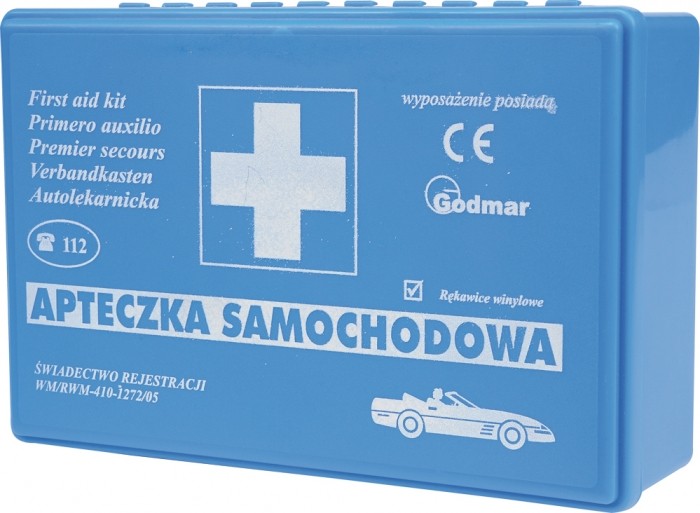 Apteczka samochodowa z wyposażeniem. Wygodne i trwałe opakowanie z tworzywa sztucznego. Zawartość: - opaska dziana 5 cm x 4 mb 1 szt., - kompres jałowy 5 cm x 5 cm 2 szt., - plaster z opatrunkiem 6 cm x 10 cm 1 szt., - chusta trójkątna 96 cm x 96 cm x 136 cm 1 szt., - rękawice winylowe - 1 para, agrafka 1 szt., - kompres jałowy 10 cm x 10 cm 1 szt., - instrukcja p. pomocy 1 szt., - plaster wodoodporny 72 mm x 25 mm 1 szt., - plaster wodoodporny 72 mm x 19 mm 1 szt., - opaska dziana 10 cm x 4 mb 1 szt, - naklejka z wykazem niezbędnych telefonów alarmowych w Europie 1 szt.