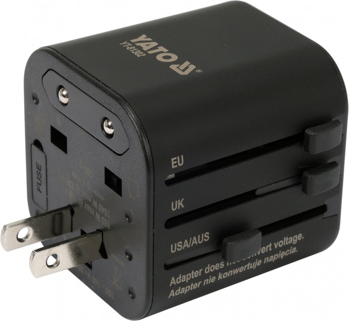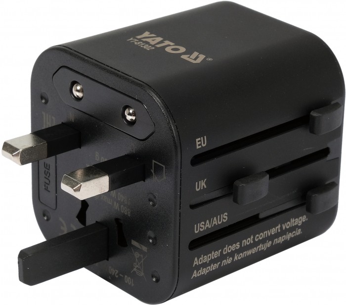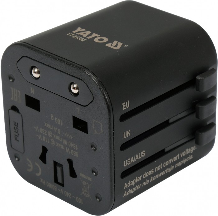 Wysuwane wtyczki z mechanizmem blokady, który zabezpiecza przed wsunięciem się pinów z powrotem do obudowy. Adapter zabezpieczony przed zwarciem za pomocą łatwo dostępnego bezpiecznika ceramicznego. Obudowa wykonana z wytrzymałego tworzywa sztucznego o zmniejszonej palności.