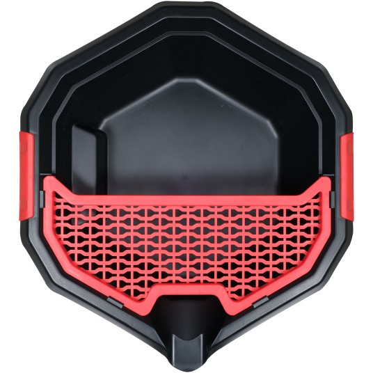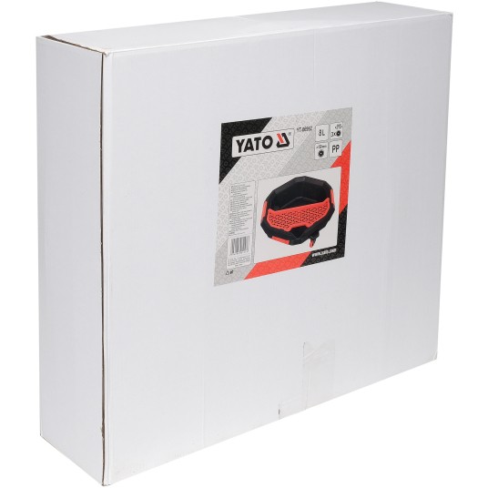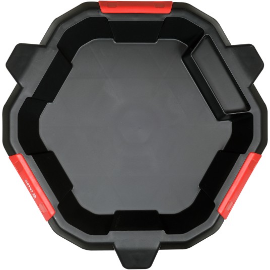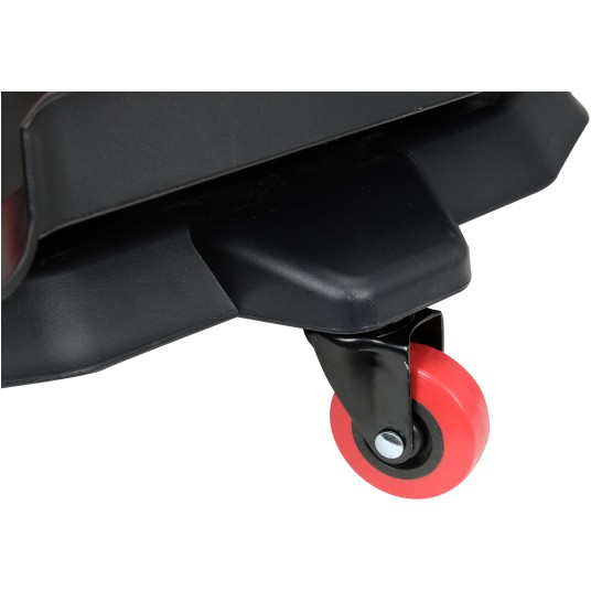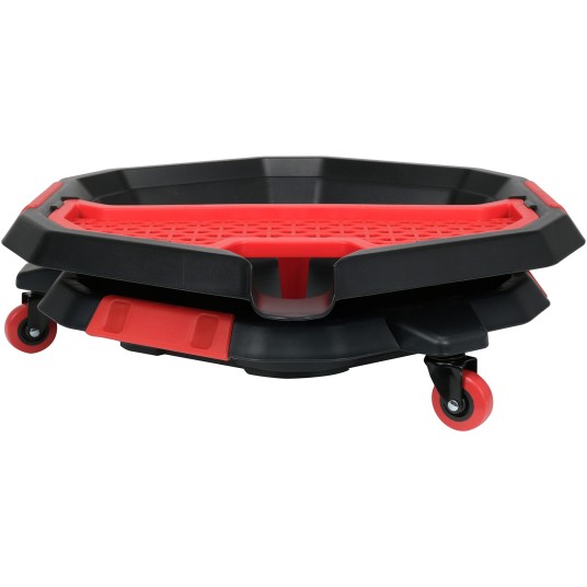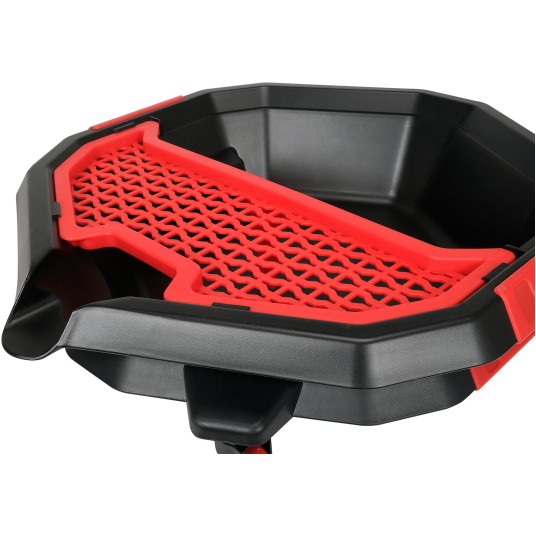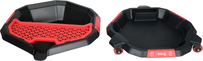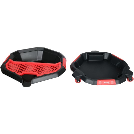Miska do wymiany oleju z dodatkową tacą na akcesoria i narzędzia. Trzy kółka umożliwiają szybką korektę położenia miski.