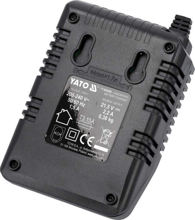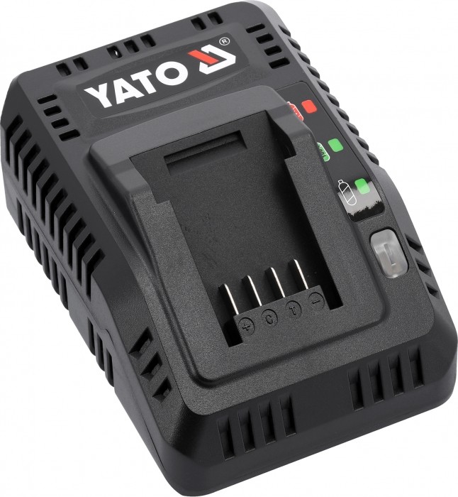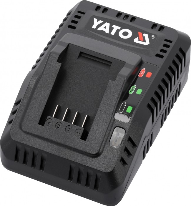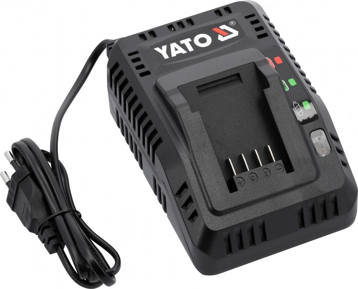Podstawowa ładowarka wszystkich akulmulatorów systemu 18 V YATO. Wbudowany system testowania sprawności akumulatora oraz temperatury dba o żywotność baterii. Nie podejmuje ładowania, kiedy ogniwa są zbyt rozgrzane. W przypadku baterii przechowywanej w ujemnej temperaturze rozpoczyna ładowanie, gdy bateria osiagnie temperaturę powyżej +5 stopni Celsjusza.