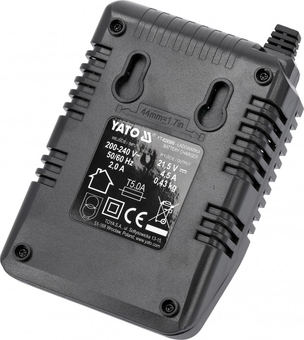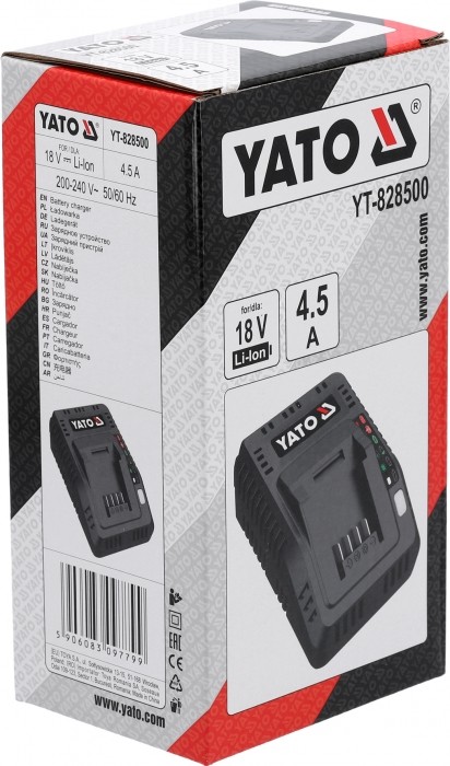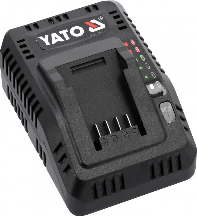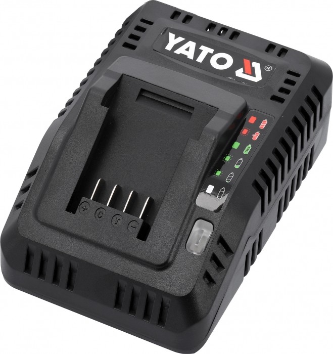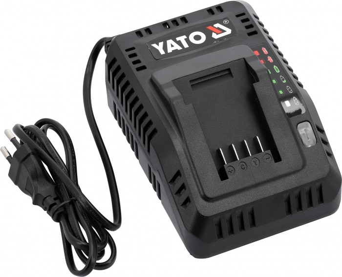 Szybka ładowarka wszystkich akulmulatorów systemu 18 V YATO. Wbudowany system testowania sprawności akumulatora oraz temperatury dba o żywotność baterii. Nie podejmuje ładowania, kiedy ogniwa są zbyt rozgrzane. W przypadku baterii przechowywanej w ujemnej temperaturze rozpoczyna ładowanie, gdy bateria osiagnie temperaturę powyżej +5 stopni Celsjusza.