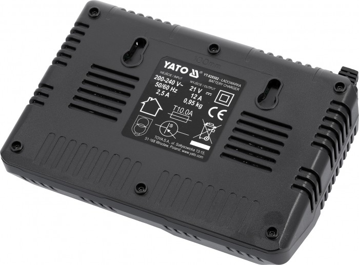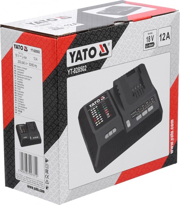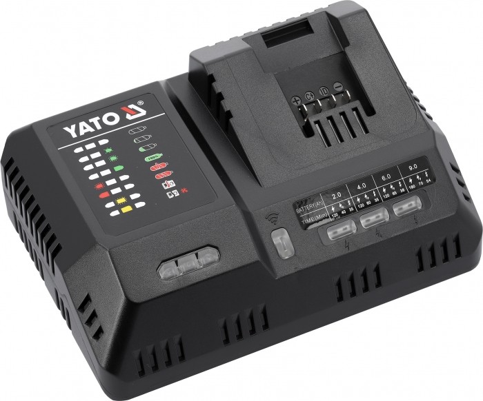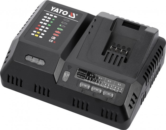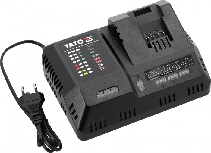 Najszybsza na rynku ładowarka do akumulatorów litowo-jonowych systemu 18 V YATO. Urządzenie wykrywa rodzaj akumulatora który został podłaczony i ładuje go maksumalnym bezpiecznym natężeniem prądu, które dany akumulator jest w stanie przyjąć, dozujac prąd w zakresie od 2A do 12A. Ładowarka wyposażona jest w wentylator, który chłodzi ogniwa podczas ładowania.