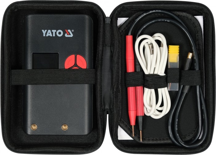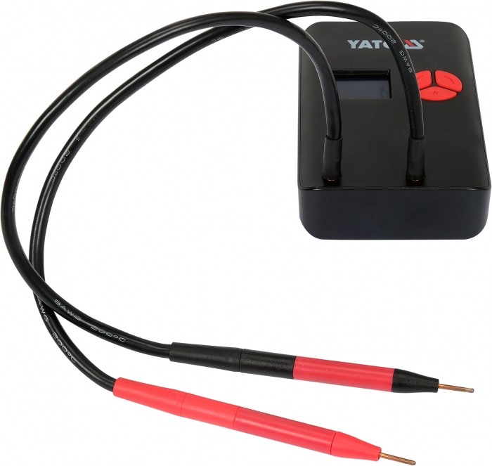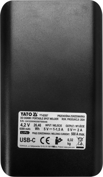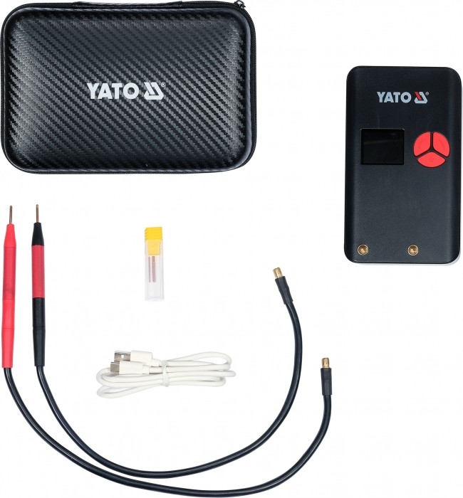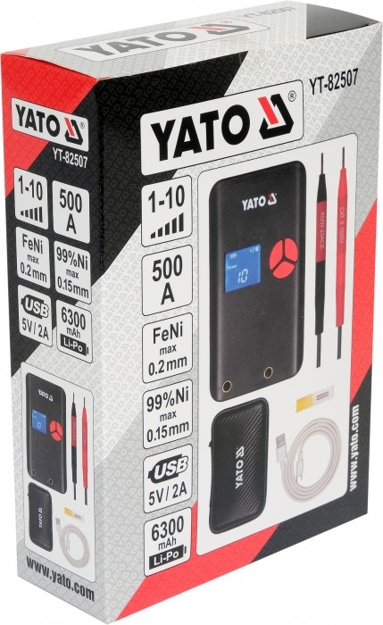Urządzenie daje maksymalny prąd zgrzewania na poziomie ~500 A. Jest to średnia realna wartość natężenia prądu mierzona w okresie 100 ms. Niektórzy producenci zamiast realnego prądu zgrzewania podają parametry prądowe mosfetów lub wartość prądu szczytowego. Z punktu widzenia danych technicznych jest to prawda, jednak w praktyce uzyskanie prawidłowego zgrzewu przy użyciu taśmy niklowanej o grubości 0,15 mm często staje się niemożliwe. Przenośna zgrzewarka punktowa YATO umożliwia wykonanie prawidłowych zgrzewów przy uzyciu taśm niklowanych o szerokości 8 mm i grubości 0,20 mm oraz taśm niklowych o szerokości 8 mm i grubości 0,15 mm.