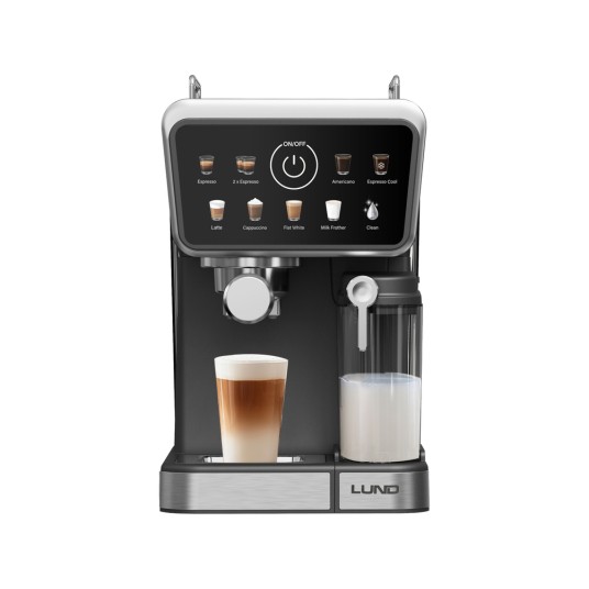 Ekspres ciśnieniowy LUND 68502 9 w 1 to wszechstronne urządzenie pozwalające cieszyć się kawą dopasowaną do nastroju i pory dnia. Umożliwia przygotowanie nie tylko klasycznego espresso czy cappuccino, ale także latte, flat white, americano, orzeźwiającego cold brew oraz napojów z automatycznie spienionym mlekiem. Dwa rodzaje kolby – do kawy mielonej oraz unikalna na rynku do kawy w kapsułkach Nespresso®, Starbucks® i UCC® – łączą swobodę wyboru i elastyczność w codziennym użytkowaniu.