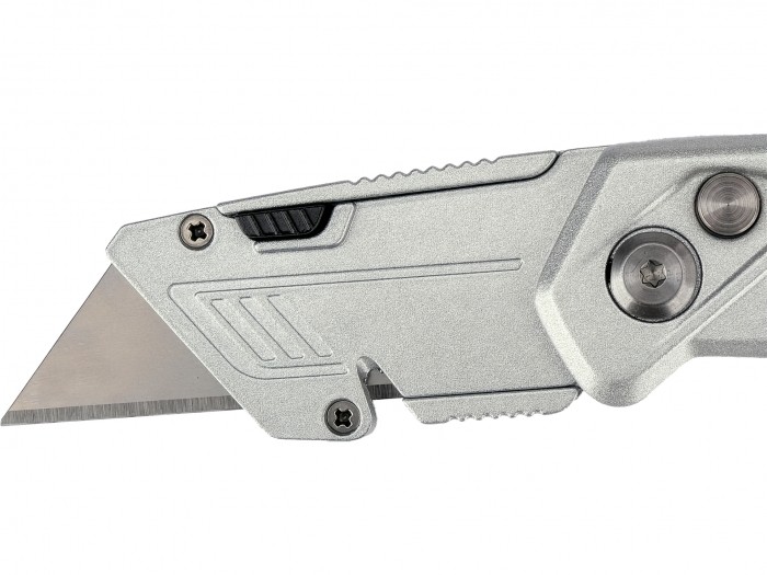 Nożyk z ostrzem trapezowym przeznaczony do intensywnych prac montażowych i magazynowych, gdzie wymagane jest mocne i stabilne ostrze. Korpus z aluminium uzupełniony elementami ABS i TPR zwiększa odporność na uszkodzenia, a jednocześnie poprawia chwyt podczas cięcia twardszych materiałów. Ostrze ze stali narzędziowej SK5 zapewnia wysoką trwałość i powtarzalną jakość cięcia.