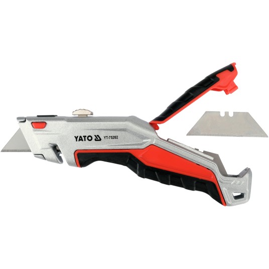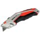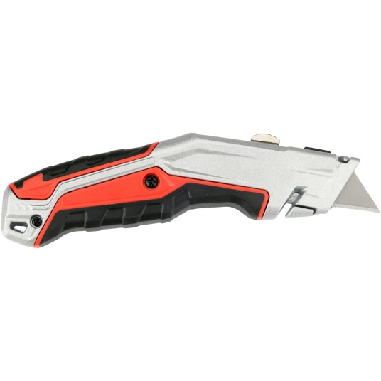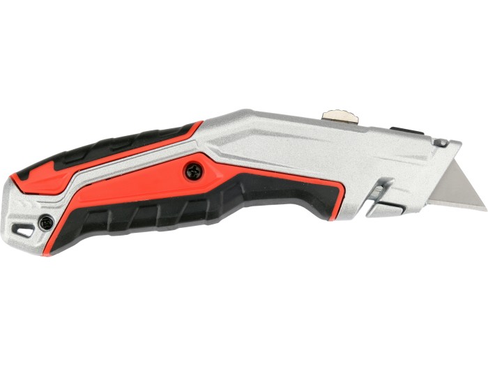 Nożyk z ostrzem trapezowym przeznaczony do intensywnych prac montażowych i magazynowych, gdzie wymagane jest mocne i stabilne ostrze. Korpus z aluminium uzupełniony elementami ABS i TPR zwiększa odporność na uszkodzenia, a jednocześnie poprawia chwyt podczas cięcia twardszych materiałów. Ostrze ze stali narzędziowej SK5 zapewnia wysoką trwałość i powtarzalną jakość cięcia.