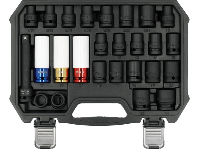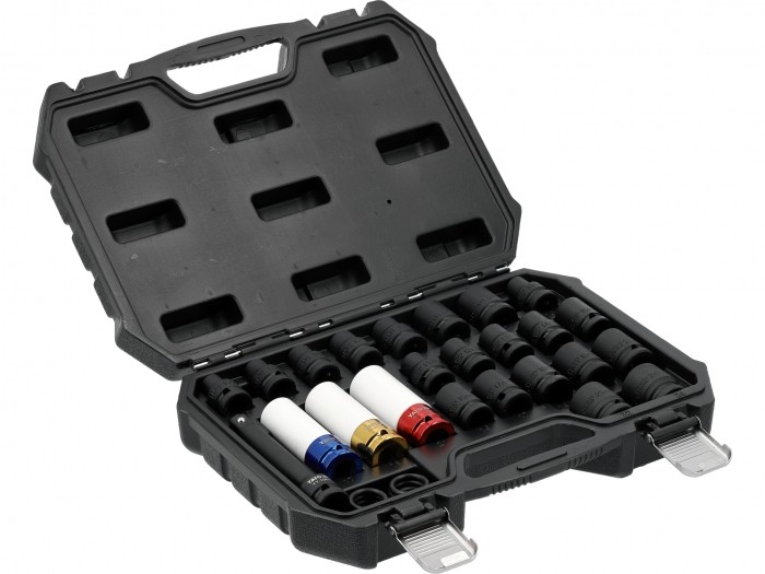Zestaw nasadek udarowych As-Drive przeznaczony do pracy z kluczami pneumatycznymi i elektrycznymi w warsztacie samochodowym oraz przy naprawach mechanicznych. Obejmuje najczęściej używane rozmiary, dzięki czemu pozwala wykonać większość typowych prac – od odkręcania kół po elementy zawieszenia i konstrukcji pojazdu.