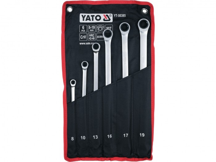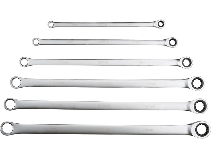 Zestaw długich kluczy oczkowych z grzechotką przeznaczony do obsługi połączeń śrubowych wymagających większej siły oraz dostępu do elementów osadzonych głębiej w konstrukcji. Wydłużony korpus zwiększa ramię dźwigni, co ułatwia przenoszenie momentu obrotowego, a mechanizm grzechotkowy z 90 zębami pozwala pracować przy bardzo niewielkim kącie ruchu bez konieczności zdejmowania klucza z nakrętki.