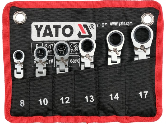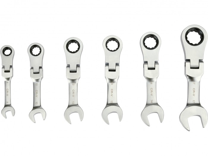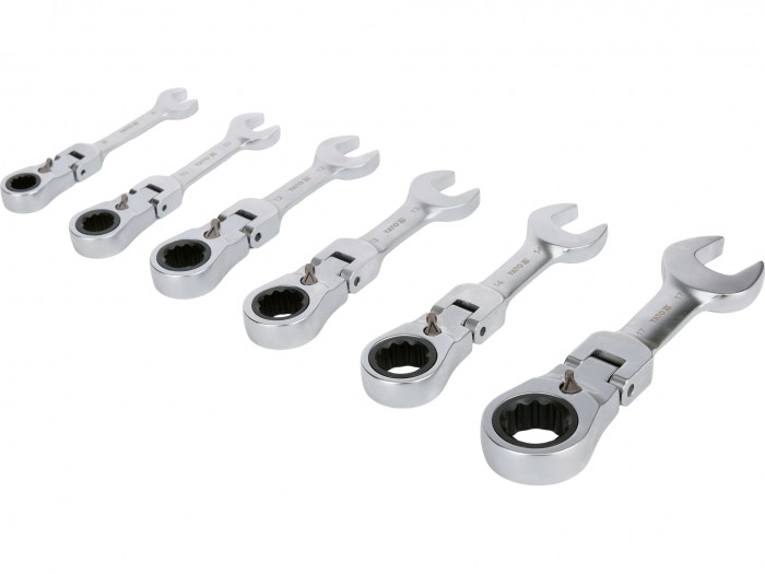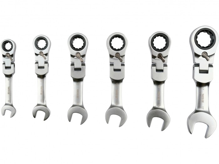 Zestaw krótkich kluczy płasko-oczkowych z grzechotką i przegubem przeznaczony jest do obsługi połączeń śrubowych w miejscach o bardzo ograniczonej przestrzeni roboczej. Kompaktowa konstrukcja oraz ruchoma główka umożliwiają ustawienie klucza pod dogodnym kątem, co ułatwia pracę w ciasnych komorach silnika, instalacjach technicznych oraz podczas montażu elementów mechanicznych. Mechanizm grzechotkowy z 90 zębami zapewnia bardzo mały kąt pracy i pozwala na płynne dokręcanie lub odkręcanie bez konieczności zdejmowania klucza z elementu złącznego.