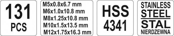 zawiera: wiertła do rozwiercenia uszkodzonego gwintu (5 szt.), gwintowniki jednostopniowe do wykonania gwintu pod nową wkładkę (5 szt.), wkładki spiralne (5 paczek), pokrętła do wkręcenia wkładek spiralnych (5 szt.), wybijaki (5 szt.), klucz imbusowy, walizkę