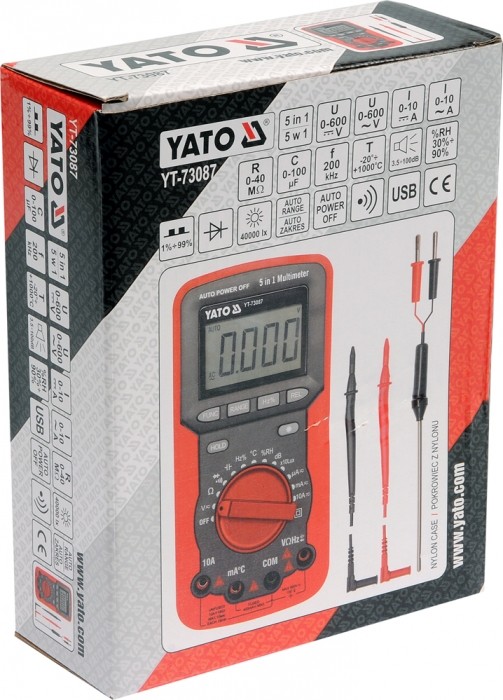 Miernik uniwersalny YT-73087 z automatycznym zakresem dla każdego pomiaru to produkt, który łączy ze sobą możliwości pięciu osobnych urządzeń. Oprócz wykonania podstawowych i zaawansowanych pomiarów elektrycznych, multimetr potrafi zmierzyć wilgotności powietrza, temperaturę otoczenia oraz np. cieczy czy przewodu za pomocą dołączonych do zestawu sond pomiarowych, natężenie dźwięku w decybelach oraz natężenie światła w luxach. Wszystkie te funkcje pozwalają ocenić jakość pracy urządzeń elektrycznych w znacznie większym stopniu, niż tradycyjne mierniki elektryczne. Możemy zbadać ilość światła generowanego przez żarówkę, sprawność systemu nagłośnienia. Możemy także sprawdzić, czy warunki są odpowiednie dla pracy urządzeń elektrycznych (wilgoć i temperatura).